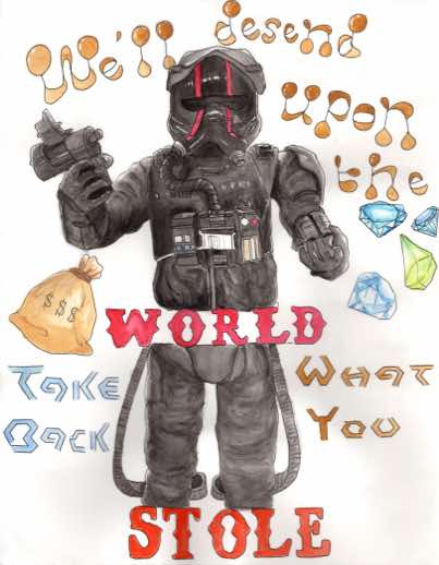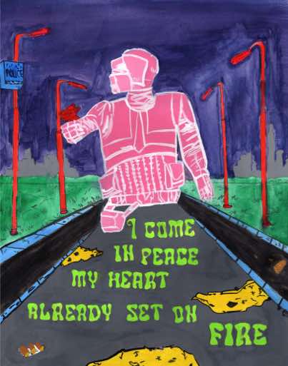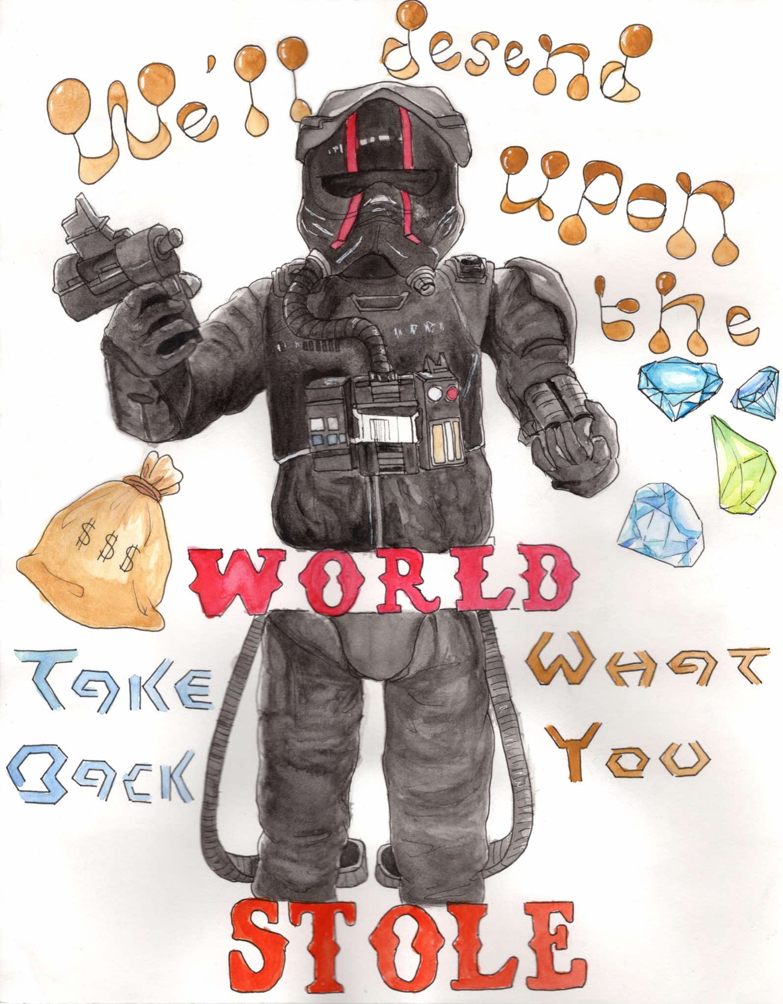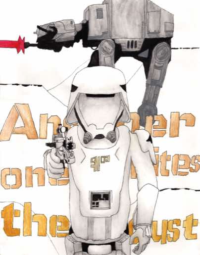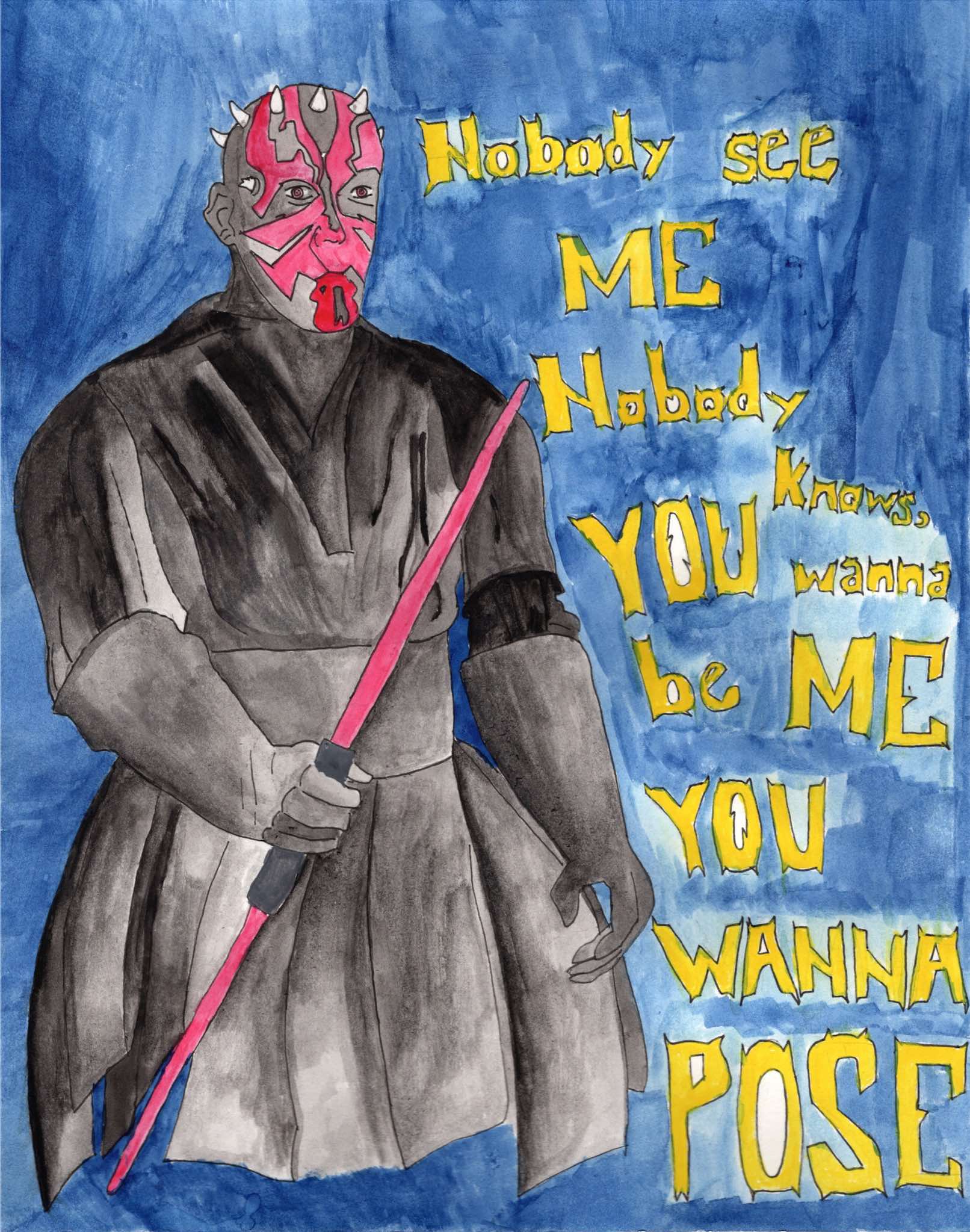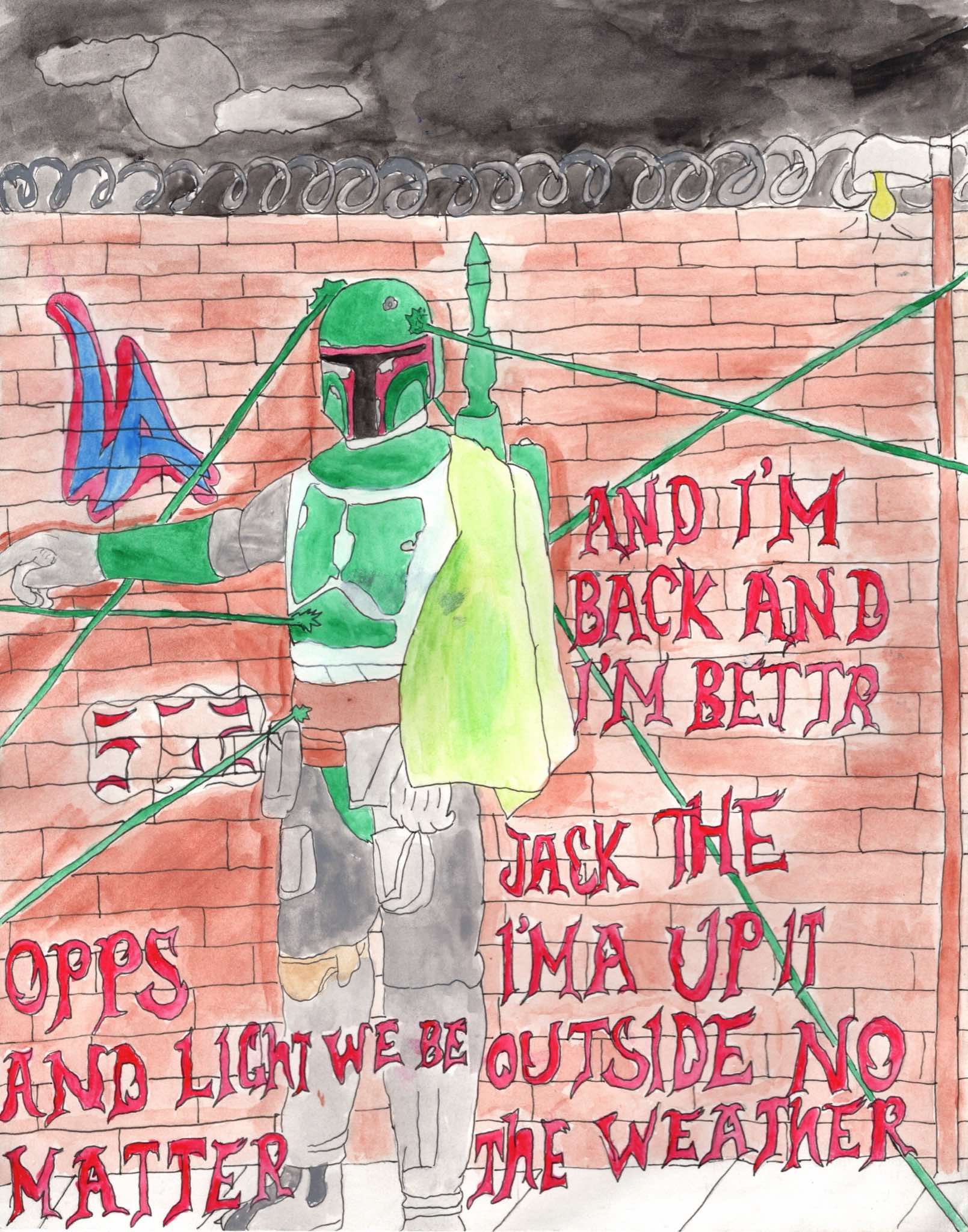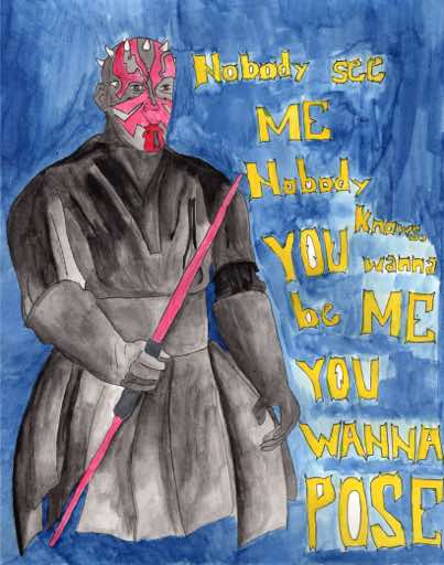 JGHS Advanced Art students drew a Star Wars action figure from life. Once the figure was drawn, a song was selected for the character to inhabit. The students had insert a snippet of lyrics and add background elements to enhance the image. These drawings were executed with waterproof ink pen and watercolor paint.